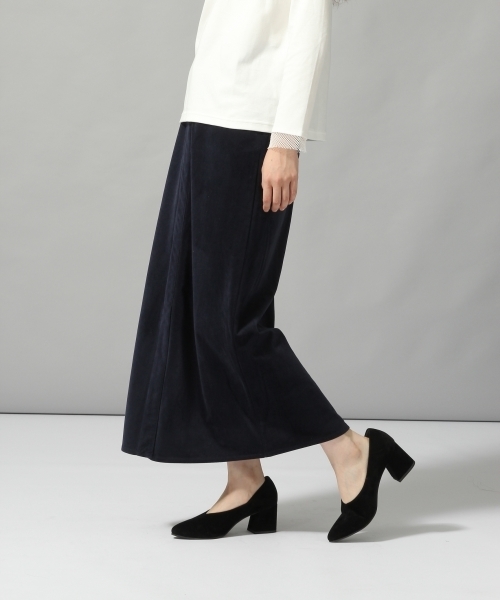 トレンドのベロア素材をペンシルスカートに。 フロントは前開き風のデザインに、穿きやすさを重視して 光沢感が控えめな落ちついた生地を選んでいます。。 またミニマルな雰囲気に仕上げる為に、ステッチが極力出ないように、 また同様にボタンフライ、ホック仕様にしています。 フロントに長めに入れたスリットもオトナ見えさせるポイントです。 スウェットやブルゾンと合わせたスタイリングがおすすめです。