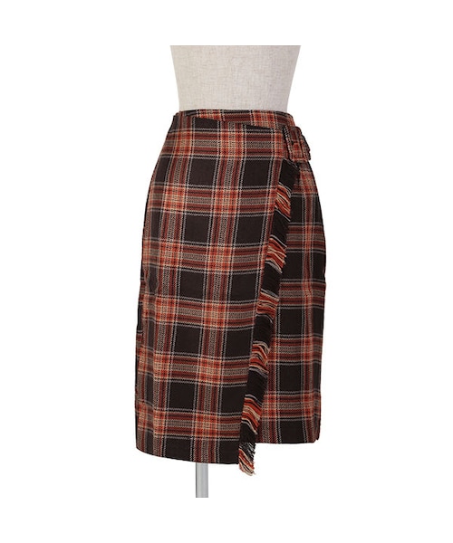 トレンド感のあるラップデザインに仕立てた、チェックスカート。 織り感のあるチェックの素材感とコーデのポイントになるカラーが、シーズンムードを盛り上げます。 落ち着いた丈感やウエストにあしらわれたバックルが大人っぽくまとめてくれるポイントです◎ MATERIAL: モデル身長: 158cm 表地 アクリル70%ウール30% 裏地 ポリエステル100% made in China サイズウエスト脇丈 Free72-61cm64cm