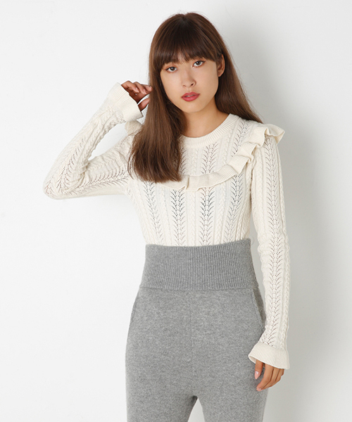 女性らしいレース編みのようなハイゲージのKNIT素材に今季トレンドのラッフルディティールをあしらったTOPSは、デニムはもちろん、ワイドPTなど、使いまわせるアイテムですが、デニムサロペットと合わせるスタイリングが特におすすめです。