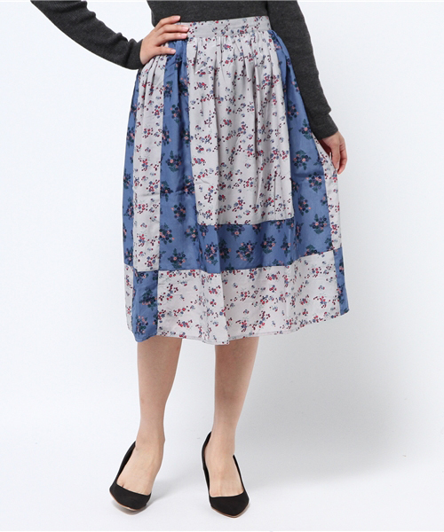 オリジナルの2種類のフラワープリントを、配色パッチワークしたふんわりスカート。ウエストは後ろで絞るスタイル。シンプルトップス合わで、旬なフォークロアスタイリングの完成◎POU DOU DOU プードゥドゥひと手間加えた存在感のある「日常着」いつまでもときめきとかわいいを忘れない方への愛着を持てるワードローブ