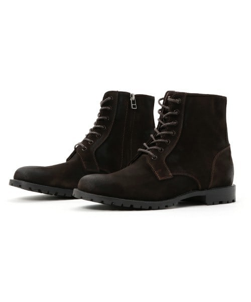 上質の牛革を使用し日本で作られたワークブーツです。 どんなスタイルにも良く似合う、シンプル&ベーシックなフォルム。 ハードになりがちなワークブーツですが、 程良くエレガントな雰囲気をプラスしてくれます。 またレースアップブーツに良くある面倒な着脱を、 内側にファスナーを付けることで解消。 いままでワークブーツを敬遠していた人に是非おすすめです。 マットな仕上がりで落ち着いた雰囲気のブラックと、 上品な雰囲気のダークブラウンスエードの2色ご用意しました。