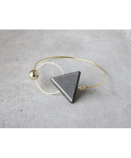 秋冬に向けた新色。 三角がモチーフの特殊紙に、金のストライプ箔をのせたバングルです。 サークルパーツを金の球に引っ掛けて、着用できる仕様です。 大振りな三角のモチーフが、シンプルなコーディネートのアクセントにもなります。 こちらの商品はチャコールの他にもホワイト、グレー、ブルージーンをご用意しております。 ーmaterialー モチーフ : 紙 バングル : 鋼(真鍮+金の合金) 輪っか : 真鍮+合金メッキ 樹脂パール