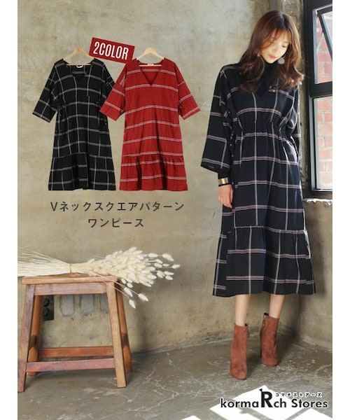 【Vネックスクエアパターンワンピース 】自由なカジュアルなルーズに落ちるワンピースタイプで簡単にコーディネートしやすいアイテムです。