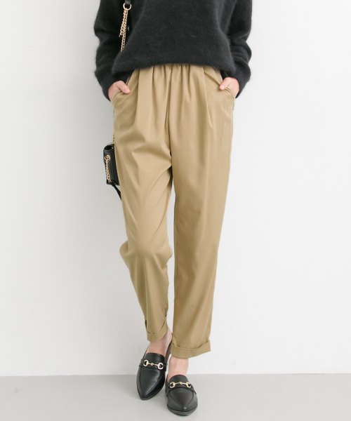 ウエスト部分にたっぷりとギャザーが施された、人気のテンセルストレッチパンツ。 軽く、やわらかな素材感にストレッチを効かせたおつくりで、自然に体にフィット。 お腹周りをふんわりとカバーするディテールとウエストゴムが、着痩せとストレスフリーを同時に叶えます。 程よく細身でゆるすぎないシルエットで、ざっくりニットやチュニックとのコーディネートも難なく攻略できます。 合わせ易いベーシックカラーから、トレンドのテラコッタカラーまで飽きのこないバリエーションでご用意しました。 ※伸縮性あり ※この商品は、素材の特性上、雨や水に濡れると、縮んで波打った状態になることがありますので、ご注意ください。 また、摩擦や水濡れ等により他のものに色移りしたり、毛羽立って白くなることがありますので、ご注意ください。 ※その他お取り扱いに関しましては、商品に付属のアテンションタグをご確認の上、充分注意ください。洗濯:ドライクリーニング
