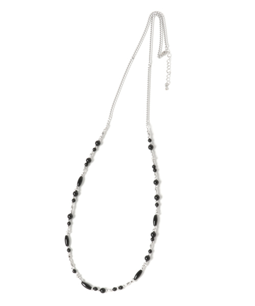 ブラックビーズをあしらったチェーンネックレス。シンプルなデザインで手軽に着こなしのアクセントになります。これ一つで着用頂くのは勿論、既にお使いのネックレスに合わせた重ね付けもオススメ。男女問わずユニセックスでお使い頂けるので、ご自身用は勿論、プレゼントにもオススメです。
