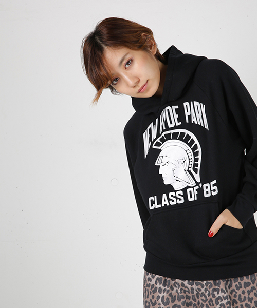 【NEW HYDE PARK POJ】 メンズライクなグラフィックデザインパーカー。ボトムはタイトスカートなど、レディライクなものとの合わせがおすすめ。