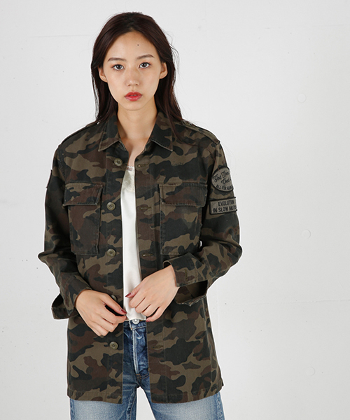 【GRAFFITI MILITARY JKT】 バックのプリントを染み込みプリントにして、少しかすれさせたデザインがポイントに。レースアイテムとの合わせが今年らしくおすすめ。本格アウターの前に使える一枚です。