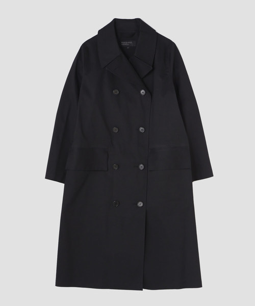 ゴム引きコットン素材を使用したマッキントッシュのロングダブルブレストコート。 前身頃に少し大きめのフラップポケット。