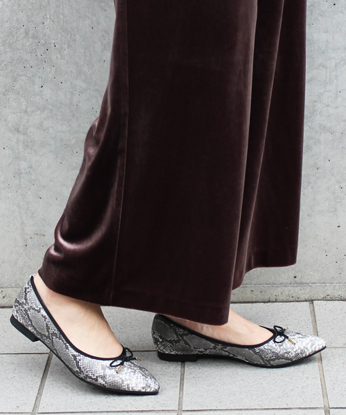 今シーズン大注目のポインテッドバレエシューズが登場♪ シルエットにこだわった美シルエット! フロントリボンにはアクセントになるゴールドのチップを施し、華やかさを演出。 パンツにもスカートにも相性抜群のマストバイな1足です。 フラットヒールで歩きやすく、デイリー使いにも万能です。 ラウンドトゥとは一味違ったス ッキリシルエットを是非お試し下さい。