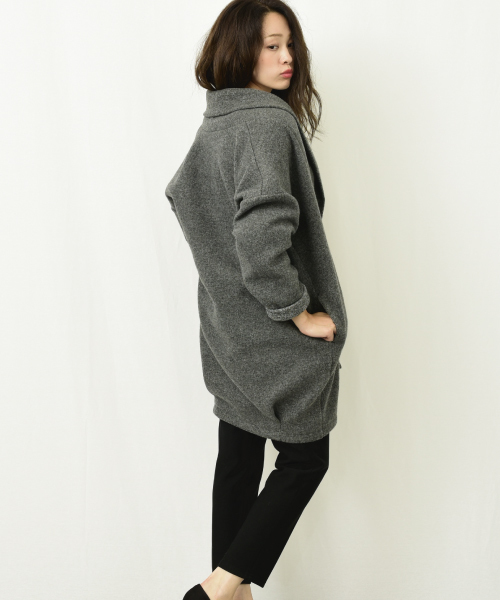 抜け感たっぷりのニットアウターの登場です。やや裾が絞られたコクーンシルエットが特徴的。ドロップショルダーとショールカラーで、エフォートレスな印象の1枚に仕上がっています。上下2段のスナップボタンで、上部のみ左右2個ついているので、首回りの開き具合を調整できる仕様です。カーディガンでは肌寒い、秋本番にぴったりの大活躍するアイテムです。