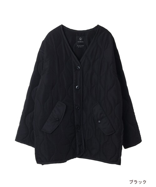 ラウンド状のキルティングがアクセントになったジャケット。シルエットや後ろの飾りベルトなどミリタリーな感じがおしゃれです。羽織るだけでこなれた印象になります。中綿入りであたたかく、保温性も優れています。今時期にさっと羽織れる軽さも嬉しいポイント。襟元がVネックなのでトレンドのオフタートルやハイネックのトップスとあわせてもすっきりして見えます。お尻が隠れるくらいの丈でボリュームのあるボトムともあわせやすいです。