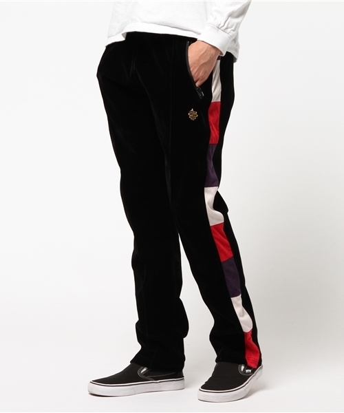 ベロア素材で仕立てたサイドラインがアクセントになったボトムスです。程よくスリムで少しだけフレアなシルエット。同シリーズのジップアップブルゾンとセットアップでの着こなしも可能です。