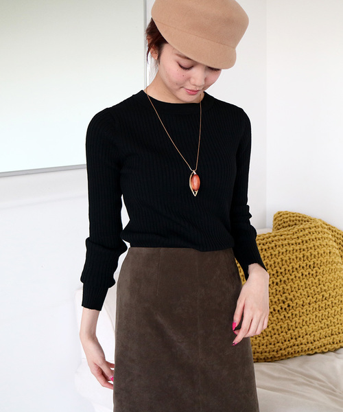 色違いで揃えたくなるほど重宝するリブニット!伸縮性のある生地で仕立て、ボディにフィットした女性らしいデザイン。凹凸のある表面感でフィットしても気になりにくく、トレンドのワイドボトム、ミディスカートのフィット&フレアでメリハリを作ります。デニムでカジュアルダウンも出来る、着まわし力のある1枚です。※同商品の追加生産分で【166-7170074/ リブニット】としてもご用意しても販売しております。