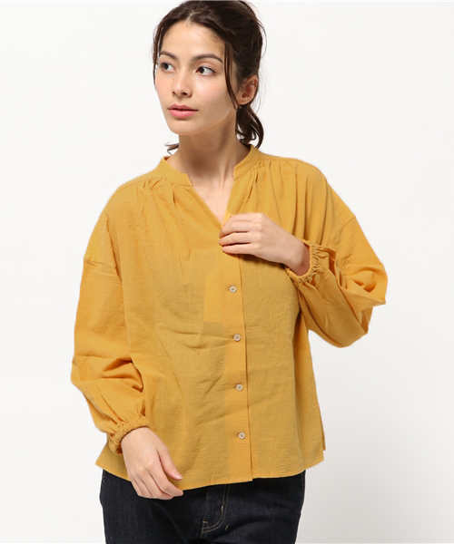 スキッパーカラーのブラウス。ほどよい抜け感とギャザーのボリューム感が旬なシルエットです。中はタートルネックインナー合わせがおすすめです。