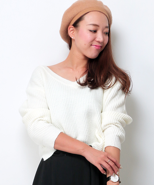 フロントはVネックでスッキリな印象に♪バックはクロスデザインで女性らしさ満載のニットです☆ 前後差のある着丈なのでスキニ―からワイドパンツまで幅広い着回しが出来るアイテムです!
