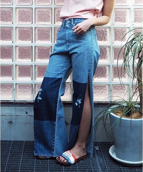 大胆にあいたサイドの深いスリットが特徴のデニムは3段階の濃淡とさりげないダメージ入り。他にないデザインでシンプルなトップスに映える1本。ヒールで大人女子スタイリングにもオススメです。MADE IN JAPAN