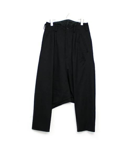sulvamでは毎シーズン形を替えリリースされている シンプルなサルエルパンツ。 股下深めで裾に掛けてテーパードの効いたシルエットで 全体の品やかなドレープ感が良いです。 生地には【sulvam】オリジナルのウールギャバを使用し 上品なツヤ感があり、デザイナーの藤田氏も満足の素材を使用しています。