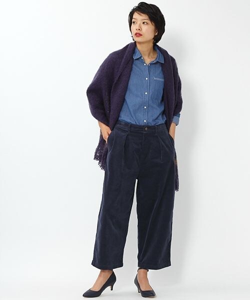 今年おすすめのコーデュロイパンツはゆったりしたコクーンシルエットがかわいい。前に入ったタックでスッキリ見えながらリラックスしてはいていただけます。裏起毛であたたかいところもうれしいポイントです。