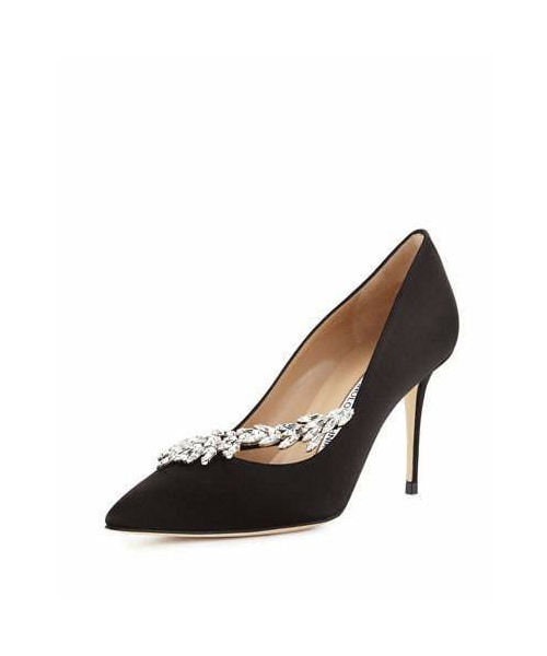 Manolo Blahnik satin pump. 3.5" covered heel. Pointed toe. Asymmetric jeweled strap. Low-dipped collar. Smooth outsole. "Nadira" is made in Italy.
