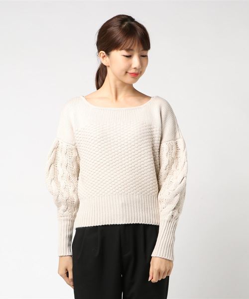 身頃と袖の異なる編み地が、定番のケーブル編みニットを上級者に仕上げてくれるニットトップス。コンパクトなシルエットながら袖のボリュームのバランスが良く、メリハリの効いたデザインニットでこなれ感を演出します。シーズンムード満載のニットはこれからの時期何枚でも揃えたくなるオススメアイテムです。しっかりと肉厚に編み上げているので防寒性にも優れています。 着丈は腰を覆うほどのジャストサイズなのでワイドシルエットのパンツやフレアスカートとも相性よく着こなせます。デザイン性のあるニットトップスはシンプルなデニムパンツなどを合わせても大人カジュアルな着こなしを作り出し、コーディネートの幅を広げてくれます。