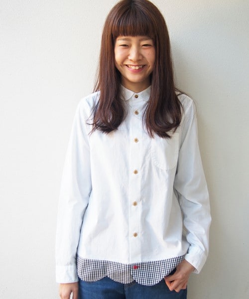 2017S/S "SALAD BOWL" お菓子屋さんの内装をイメージしてつくったシャツ。 打ち込みのよい綿平織り素材を使い部分的にチェックの生地を組み合わせたデザインシャツです。裾のスカラップとお菓子の様な釦がポイント。