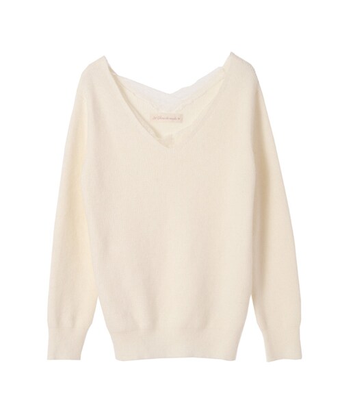 両面Vネックの大人っぽいシンプルニットに、繊細なレースを衿ぐりに施したフェミニンニット。