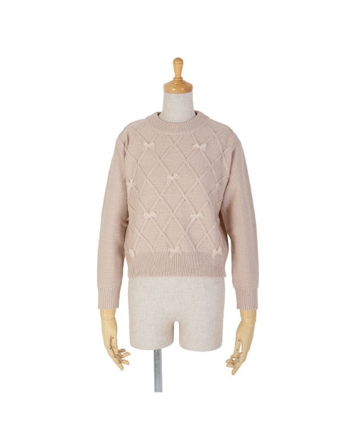 可愛らしいダイヤ編みが目を惹くニットプルオーバー。 ところどころにあしらわれたチュールのプチリボンがガーリームードを漂わせます。 ややハイネックになっているのも今年らしいポイント◎ スカートやパンツなど様々なボトムと相性抜群なので、ぜひこれからのワードローブに加えたい一枚です♪ MATERIAL: モデル身長: 150cm アクリル100% made in China サイズ着丈胸囲肩幅袖丈 Free48.5cm99cm36cm52.5cm
