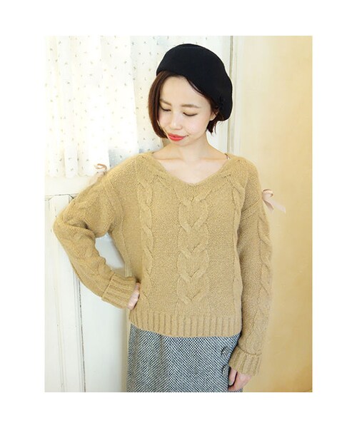 袖にあしらったリボンがポイントのニットプルオーバー。 ドロップショルダーの切り替えがボディをより華奢に魅せてくれます。 ゆったりとしたシルエットとVネックの衿ぐりがいつもより大人っぽい印象♡ 表情のあるケーブルの模様は、シーズンらしい温もり感を感じさせます。 少し長めの袖は、折り返してもたるませてくしゅっとさせるのも◎ MATERIAL: モデル身長: 158cm アクリル58%ナイロン27%ウール7%アルパカ5% ポリウレタン3% made in China サイズ着丈胸囲肩幅袖丈 Free52cm104cm50cm53cm