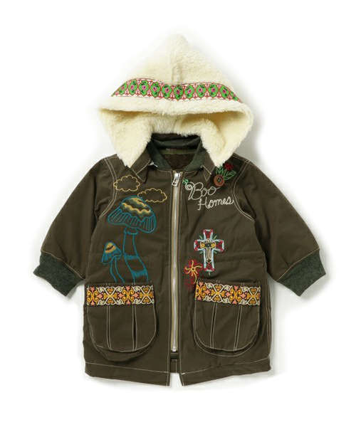 ブーフーウーらしいこだわり抜いたフライトジャケットの登場です。 温かみのあるシープボアのフードや暖かいフリースのライナーベストは取り外しできるので、春や秋の肌寒い季節から真冬まで、長いシーズン着れちゃう便利なアイテムです。 ブーフーウーならではの不思議な世界観をイメージした刺繍やアップリケを施した贅沢な一枚で、モッズコートとMA-1をミックスしたようなデザインです。 ゆったりとしたシルエットも、内側のウエストゴムでタイトなシルエットにも変化出来るので、色々なコーディネートが楽しめます。 フード・ライナーは取り外しが可能です。