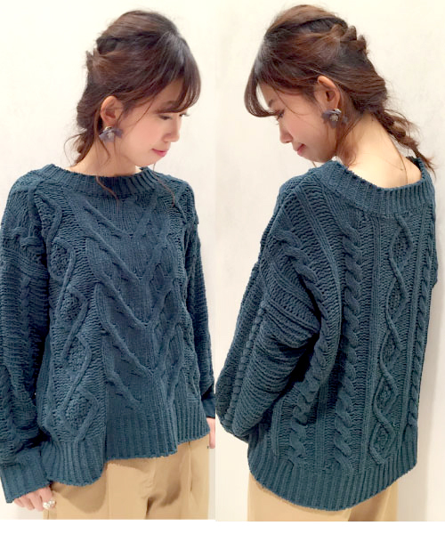 ◆モールヤーンのケーブルニット◆糸の光沢と軽やかな質感が特徴のモールヤーンを使用したふわふわニットケーブルプルオーバー。もこもことした立体感のあるケーブル編みと優しい手触りが女性らしいアイテムです。ゆったりとした衿元で抜け感があり、女性らしい印象を与えてくれます。1枚で着用して頂くのも勿論、シャツをインしてレイヤードもお楽しみ頂けます。シンプルなデザインなのでアウターも選ばずカジュアルもキレイメコーデにもO.K♪ワイドパンツやロングスカートを合わせ、ルーズなシルエットを楽しむスタイリングがオススメです。勿論、お手持ちのスキニーパンツやタイトスカート合わせでも素敵です♪お手持ちの小物合わせでアレンジ自在です。カラーも5色展開でカラーバリエーションも豊富なので、1色プラス遊びの色を選んでみるのもいいですね。色によってコーディネイトテイストの変化をお楽しみ頂けます。