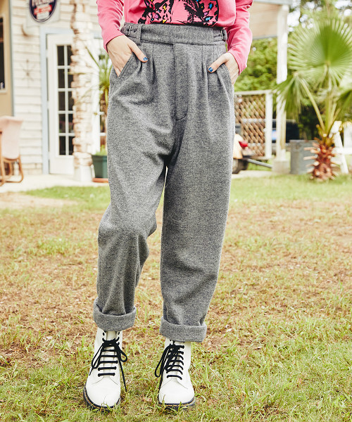 『ラノウールの軽くて暖かな着心地のよさを実感』 メンズのスラックスをレディース用にアレンジしたボリュームのあるツータックパンツをフェルト素材のような独特の風合いを醸すフラノウールで作りました。軽くて暖かな着心地のよさを実感できます。 デザインはウエストのサイドベルトが特徴的なグルカパンツのディテールを採用。裾は冬に合わせてソックスやハイカットシューズとの相性がいい7分丈に仕上げました。タックが効いたボリュームとストレートながらシャープに見える丈感で、履くと下半身のすっきり見せが叶います。 旬なタックインのコーディネイトがしやすいデザイン 今季らしい、タックインのコーディネイトがしやすいように、サイドベルトをウエストにつけデザイン性をプラスしました。タックを入れることで立体感が出た腰回りと下へストンと落ちるラインで、ゆるさのあるシルエットなのに美脚が叶います。ボリューミーなトップスでルーズに合わせても、タイトなトップスをタックインしてメリハリをつけても、お洒落なスタイリングが完成!