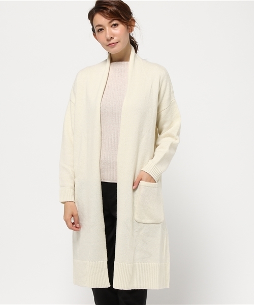 ウール混のソフトなあたたかさが心地よいニットカーディガン。ガウンのように羽織れるボタンレスのきれいなシルエットは前を開けて羽織っても様になり、付属のキルトピンで留めても素敵です。 パンツからスカートまでしっかりと活躍する今季も欠かせないアイテム。