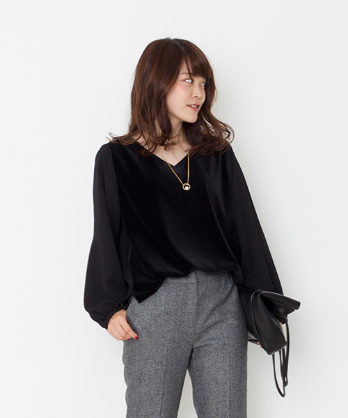 前身頃と切り替えた、ベルベットドッキングブラウス。ベルベット×シフォンは、異素材を同系色で揃えているので、大人顔な仕上がりです。ショルダーやバックに柔らかい生地をもってくることにより、女性らしいニュアンスを引き出すデザイン。裾にスリットが施された今年らしいディティールも洒落っ気ポイントです。