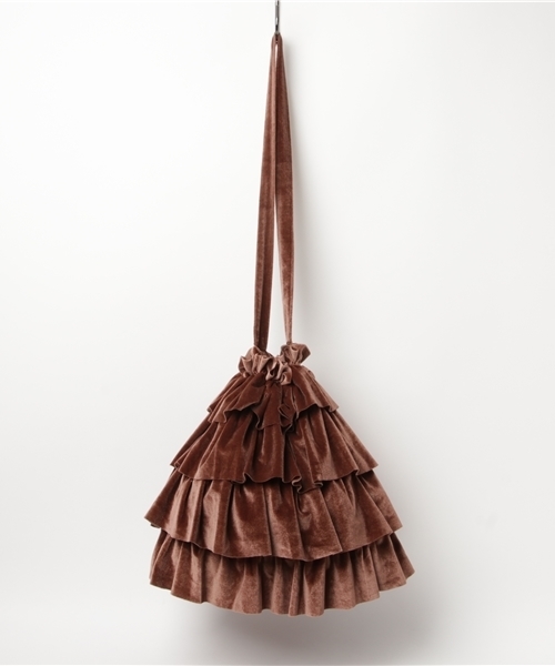 ベロア素材で出来たフリルバッグ。 生地によって季節感があり、カラーもより深みのある見え方になります。 落ち着いたカラーバリエーションなので、フリルでも不思議と甘すぎず、コーディネートのアクセントにおすすめです。 口はドローストリングで巾着風に絞れます。裏地は鮮やかなサテンで中もかわいいバッグです。 長めのショルダータイプの旬なデザインです。