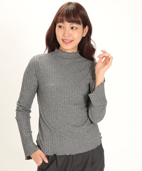 フリルのような揺らぎが特徴的なカットソーは最近注目のモックネック丈に近いのでニットなどを合わせても、さりげなく首元を彩ってくれそう。季節を問わないアイテムなので3シーズン活躍できそうな着回し力もポイント。
