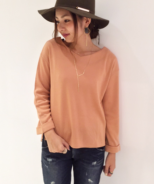 ◆起毛感のある素材が心地いいプルオーバー◆シンプルなIラインネックレスが付いたカットソーは着心地も良く、ニットに変わる冬のコーディネートアイテムとして十分に暖かいです。袖に折り返しをつけ手首を見せる事で時計やバングルを引き立たせ、女性らしさを演出してくれます。コートを羽織って、インナーはすっきりとコーディネートすると女性らしい着こなしになります。ネックレス付きなのも嬉しいポイント!