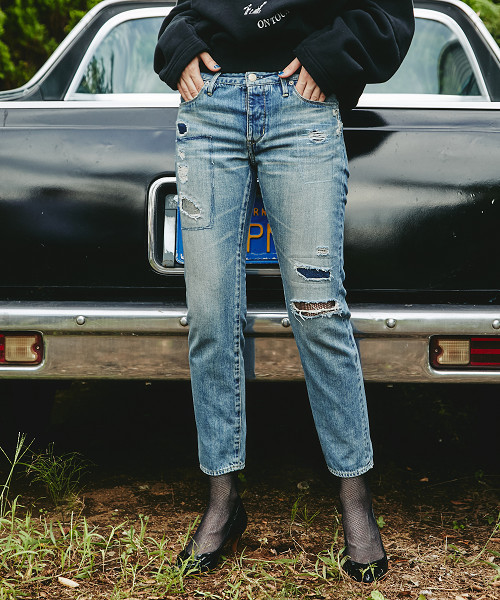 『シャトル織り機でゆっくり織ることで膨らみや柔らかさを出したダメージ加工デニム』 絶妙なタテ落ち感がでるようにムラを配し、シャトル織り機でゆっくり織ることで膨らみや柔らかさを出したデニム生地で作りました。 腿から膝にかけて入れたダメージ加工のカ所には、表情と色の異なるデニムを当て布に使用して、通常のステッチと千鳥ステッチをミックスしてリペアしているのが特徴。ストレッチが効いたスリムとは違い、程よく脚に沿うシャープですっきりとしたシルエットと9分丈で足首回りがすっきり見せることで、より美脚ラインを叶えます。 トップスのタックインでもアウトでも大人なコーディネイトが可能 カジュアルなデニムながらシャープなシルエットで、トップスのタックインでもアウトでも大人っぽい表情でコーディネイトが可能。 すっきりとした細見せを叶える9分丈なので、パンプスはもちろん、これからの寒い時期に活躍するハイカットのスニーカーやブーティなどの半端丈シューズとも好バランスなのがうれしいポイント。旬なファーやビックシルエットなど、アウターにボリューミーなコートをもってきてもメリハリ効果を発揮。スタイルアップして着こなせます。