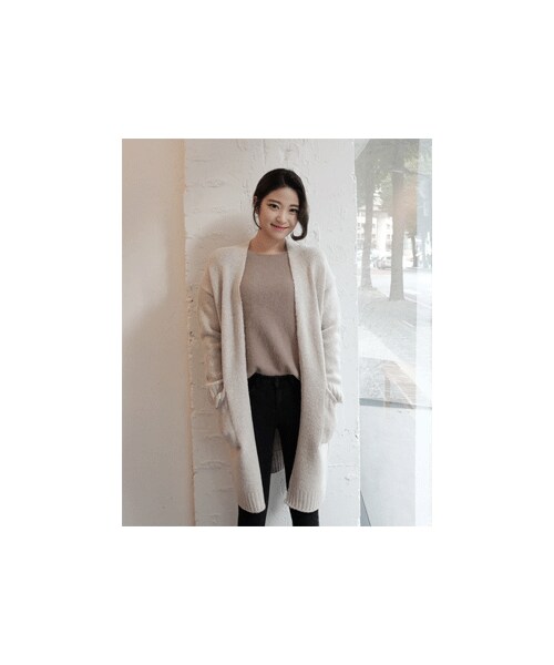 シンプルなナチュラル系ロング丈カーディガンです。 スタイリングし易いベーシックなデザインのカーディガンで、フロントのシンプルなポケットがポイントになっています☆ ヒップの隠れるルーズなオープンタイプで女の子が一番かわいく見えるシルエットに! デイリーに活躍するシンプルで可愛いアイテムです。