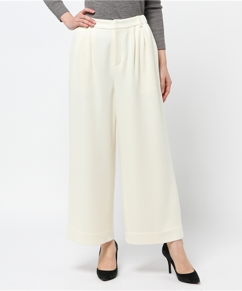 ◇NOLLEY'S◇ 上質な圧縮スムース素材を使用したワイドパンツ。 伸縮性がありしなやかなジャージー素材とゴムウエスト仕様でとても穿き心地の良い一着。シンプルなデザインと合わせやすいベーシックカラーで、オン・オフと幅広い着こなしに対応できる便利なアイテムです。