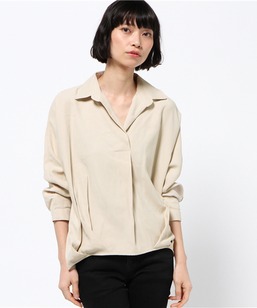 1枚で完成度の高いフロントタックスキッパーブラウス!ドロップショルダーで着心地良く、知的な印象のスキッパーは、裾がくるんとなり、ブラウジングしたようなデザイン。前後で差丈があるので、スカートはもちろん、パンツstyleもちょうどいいバランスで、INしたようなコーディネートが完成します。