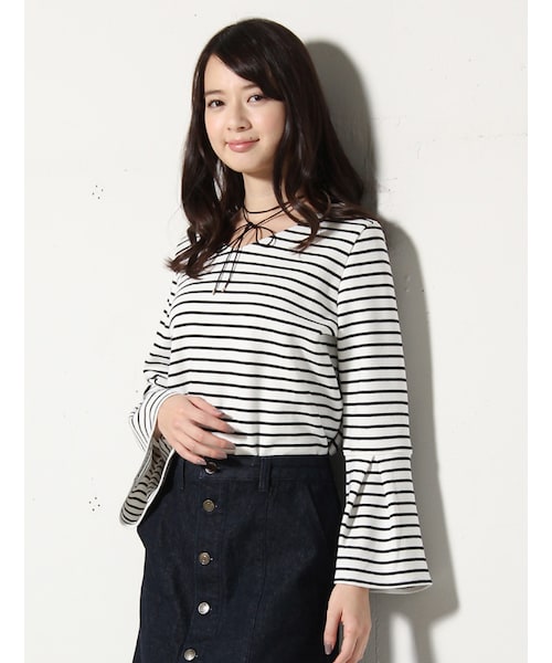 トレンド大本命のフレアスリーブ。袖にアクセントが効いているから、無地でもおしゃれな雰囲気に見せてくれる♪Vネックと相性抜群のチョーカー付きでさらに旬の着こなしに。