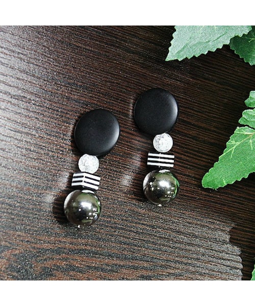 ボーダーの珍しいビーズと大きなメタリックボール、クラッシュクリスタルを組み合わせたピアス/イヤリング。 モノトーンでまとめられたデザインはシーンやコーデのジャンルを選ばずご使用いただけます。 モノトーンというシンプルな色味ながらも、コーデのアクセントになってくれるアクセサリーです。