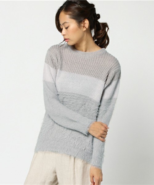 3素材のバイカラーで編みこまれた変わり編みニット。 シンプルなデザインに飽きている方には、ちょっとした変化のあるニットがお勧め。今旬なフェザーヤーン糸も混ざっていて、暖かみのある見え方です。ミドル丈なのでパンツ合わせにぴったりです。
