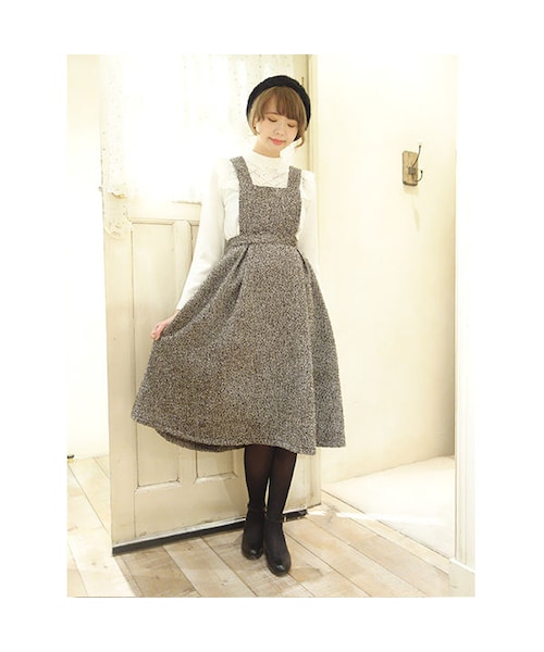 クラシカルなロング丈が印象的なジャンパースカート。 ざっくりとしたツィード素材がシーズンムードを盛り上げてくれます。 サイドにあしらわれたくるみ釦もキュートなポイント◎ サスペンダーは取り外しもできるので、シンプルなタックフレアースカートとしても使えるのも嬉しいところです♪ ブラウスやニットと合わせてグッドガールな着こなしを楽しんで♡ MATERIAL: 表地ポリエステル82%アクリル11%ポリウレタン5% 毛1%その他1% 裏地ポリエステル100% made in China サイズウエスト脇丈 Free77.5〜64cm75cm