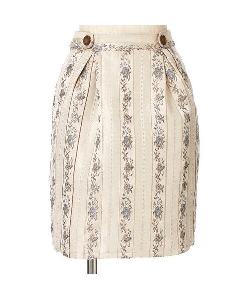 壁紙を思わせるクラシカルなジャガードが可愛らしいスカート。 丸みのあるコクーンシルエットが女の子らしさを引き立てます。 ウエストベルトにあしらわれた別珍のくるみ釦もキュートなアクセントに◎ ニットプルオーバーやブラウスと合わせて上品に着こなして…♡ ☆製品にはバックスタイルの裾にベンツ(切れ込み)が入ります。 MATERIAL: モデル身長: 150cm 表地 ポリエステル100% 裏地 ポリエステル100% made in China サイズウエストヒップ脇丈 Free71〜64cm102cm50.5cm
