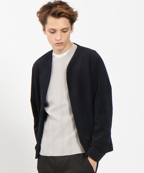 フェイクレザーを使用したノーカラーブルゾン【素材】フェイクスウェード素材を使用。【デザイン】カーディガン調のフェイクレザーブルゾン。ナローのバンドカラーなど、ノーカラーのレイヤードで軽いコーディネートがオススメです。