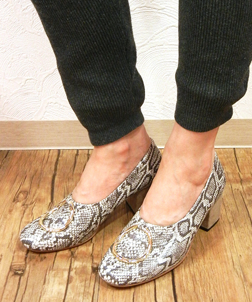 大きなメタルリングパーツがポイントのパンプス。 ブーティ感覚で履ける甲が深く隠れるカッティングがモードな印象です。 ソフトスクエアのトゥライン+太めチャンキーヒールは注目のおしゃれシルエット☆ 滑りにくいクレープ調ソールを使用しました。