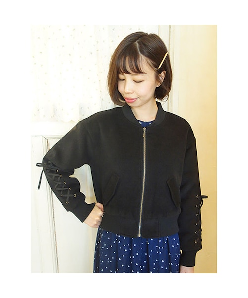 袖のレースアップがキュートなブルゾンが登場。 ミリタリーアイテムにガーリーなポイントをプラスした、今季注目のテイストミックスな一品です。 中綿の入った仕様なので、寒い季節に嬉しい防寒対策も抜群◎ ショート丈がスカートとの相性もばっちりなのでワンピースやガーリーコーデと合わせていつもの着こなしのアクセントに♪ MATERIAL: モデル身長: 158cm 表地 ポリエステル94%レーヨン3%ポリウレタン3% 中綿 ポリエステル100% 裏地 ポリエステル100% リブ ポリエステル100% made in China サイズ着丈胸囲肩幅袖丈 Free51cm106cm51cm51cm