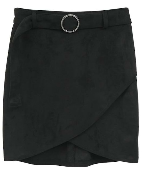 裾のカーブラインがきれいなラップ風のスカート☆ サイズ調節ができるウエストベルト付きでとてもラクチン◎ 女性らしいラップデザインが美脚をメイクします。 季節感のあるフェイクスエード素材で冬シーズンに活躍します!