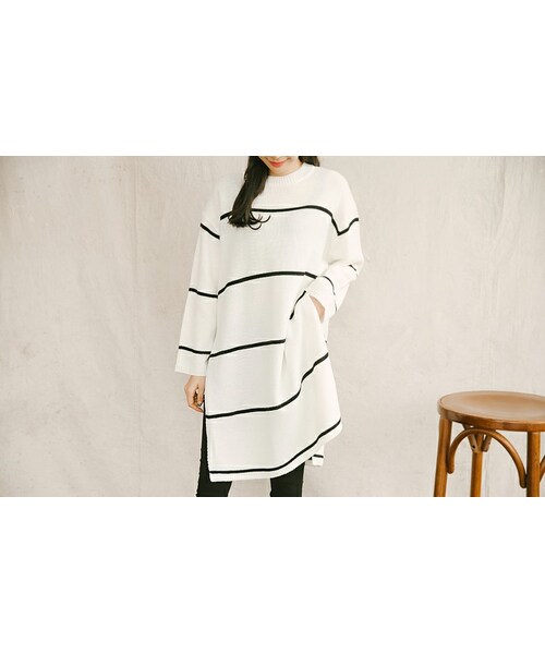 大人かわいいスタイルが完成するロングニットソー。 ボーダーを採用することでちょっとしたアクセントをPLUS。 ルーズフィットのロング丈ニットでサイドにはスリットが入っています。 程よい厚さのニット素材で冬まで活躍できます↑